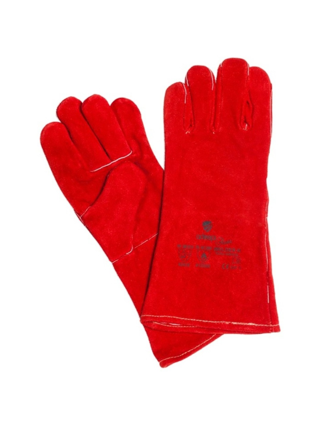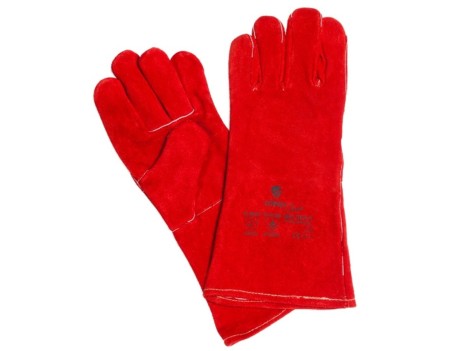 Guante soldador profesional cinco dedos fabricado totalmente en piel serraje roja con dorso y manguito largo. Certificado EPI Categoría II según normas EN 420:2003+A1:2009, EN 388:2016 y EN 407:2004.