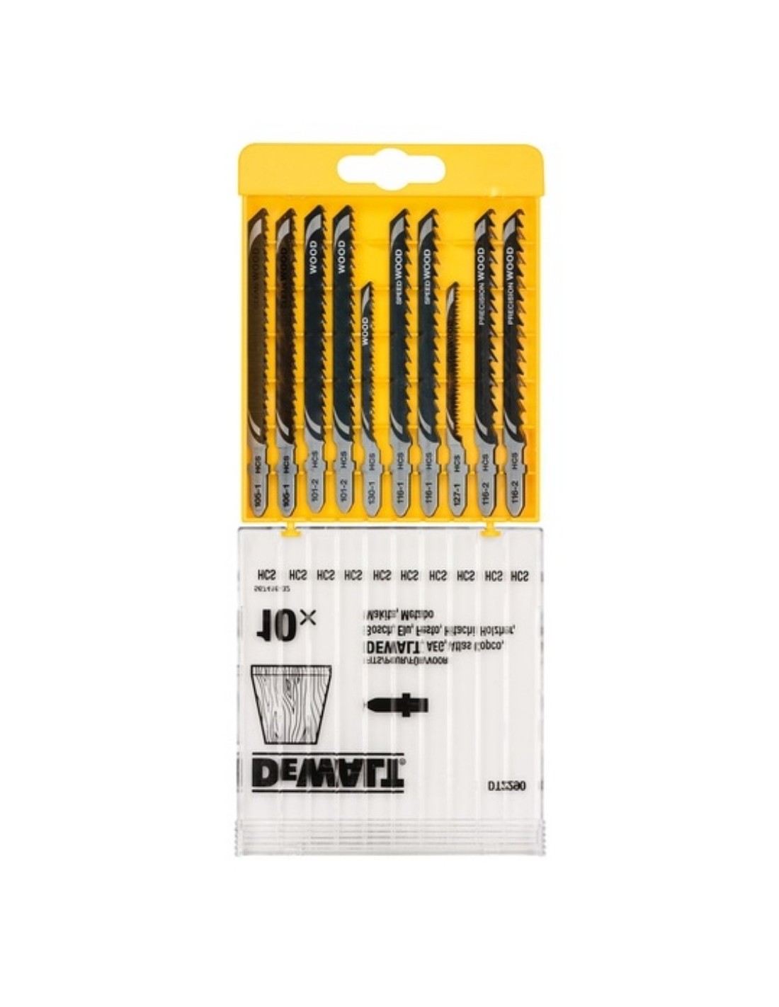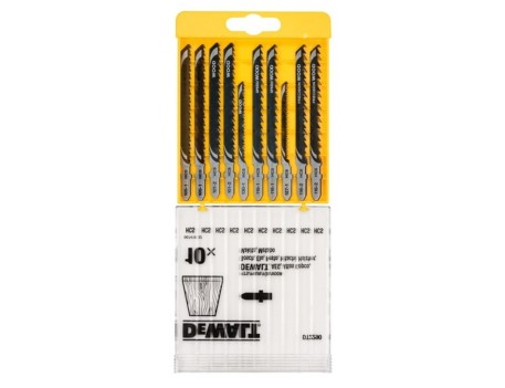 Hojas sierra calar DeWalt DT2290-QZ juego 10 unidades madera suitable wood cutting. Equivalentes Bosch T101B T119BO T101AO T111C T144D T144DP compatibilidad universal. Incluye DT2165 x2 DT2050 x1 DT2168 x1 DT2177 x2 DT2166 x2 DT2075 x2 variedad cortes. Peso 0.104 lbs altura 1 pulgada. Pack completo carpintería construcción bricolaje profesional diferentes espesores materiales madera contrachapada laminados precisión durabilidad garantizada intercambiables.