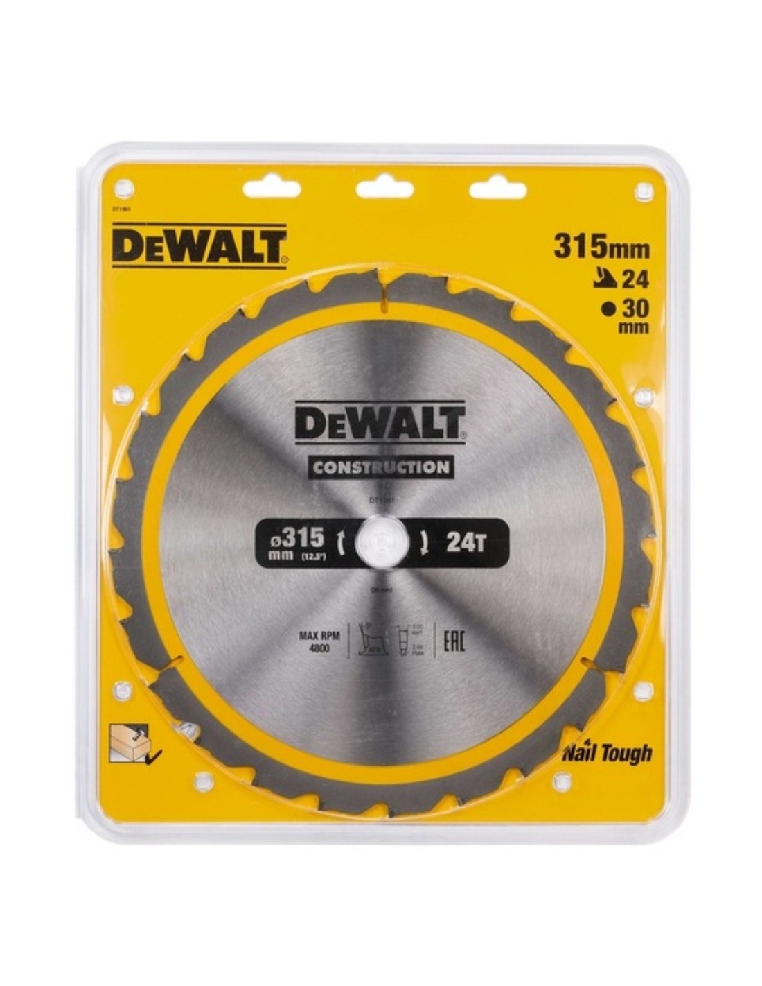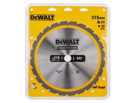 Hoja sierra circular DeWalt 315mmx30mm 24 dientes ATB construcción estacionaria. Resistente clavos, maderas naturales, materiales compuestos encofrados.