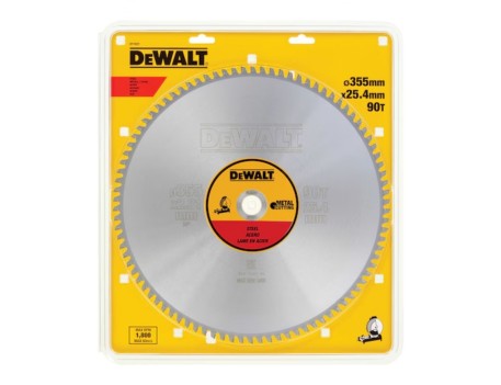 Hoja sierra tronzadora DeWalt 355mmx25.4mm 90 dientes acero TCG. Carburo titanio 12%, geometría ATB modificada, soldadura triple lámina durabilidad.