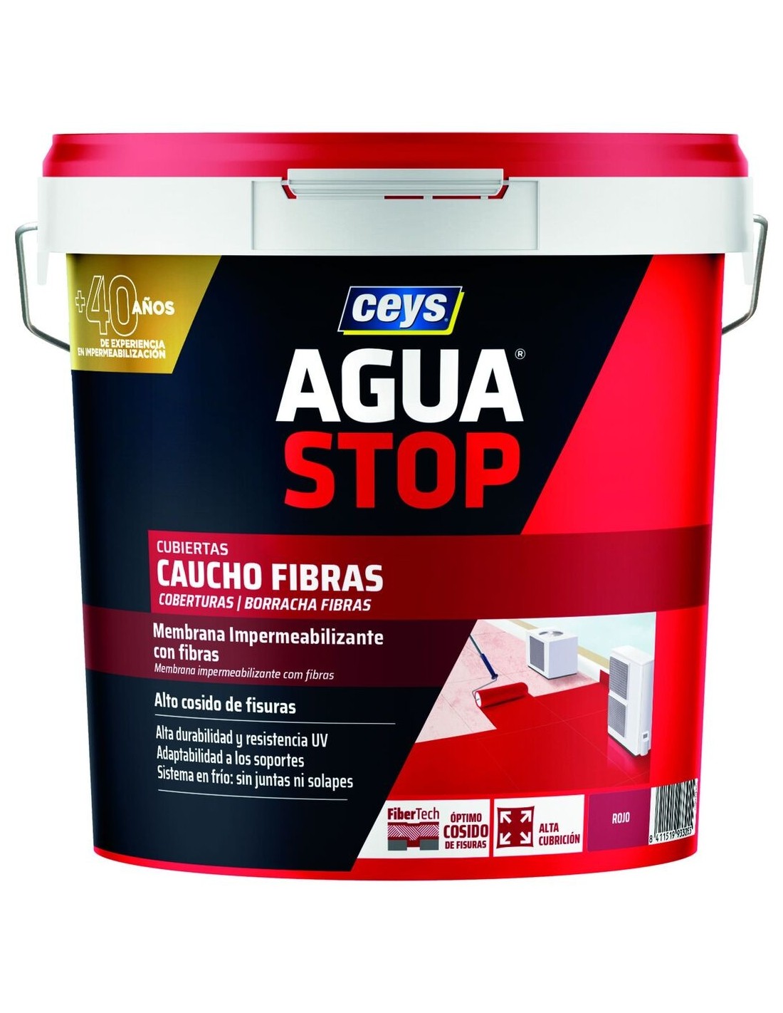 Ceys Agua Stop es un sellador impermeable a base de caucho y fibras. Ideal para proteger y sellar superficies en construcción y reparación.