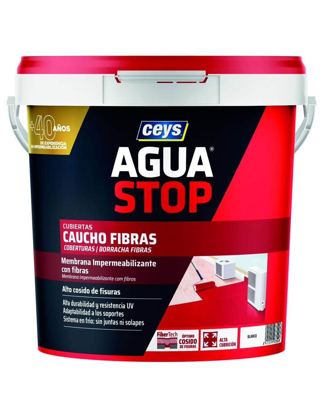 Ceys Agua Stop es un sellador impermeabilizante de caucho y fibras, ideal para prevenir filtraciones en techos y superficies. Alta resistencia y fácil aplicación.