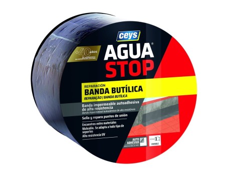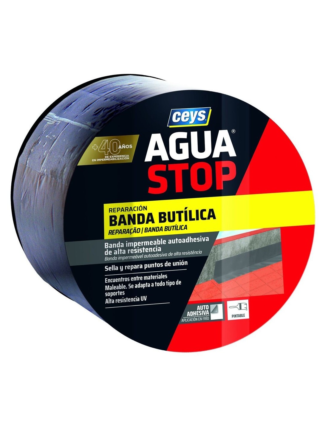 Banda impermeable CEYS Aguastop de 10m x 10cm. Ideal para sellar filtraciones y humedades en cualquier superficie. Fácil aplicación y alta resistencia.