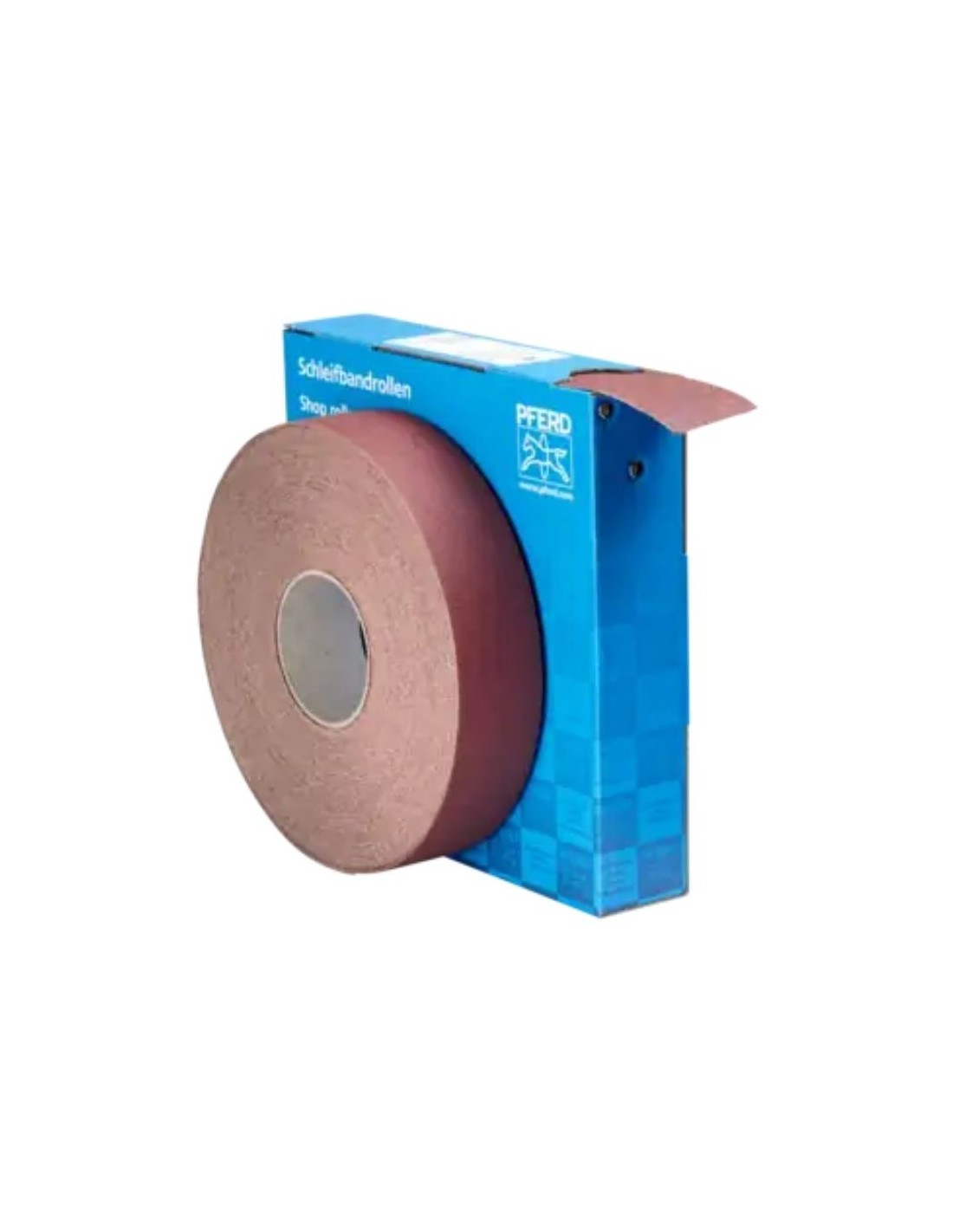 Rollo de lija de corindón A, tejido SBR, de 50 mm de ancho y 50 m de longitud, tamaño de grano 100 para aplicación universal, tipo PFERD TOOLS SBR 50, con diámetro de agujero de 75 mm.