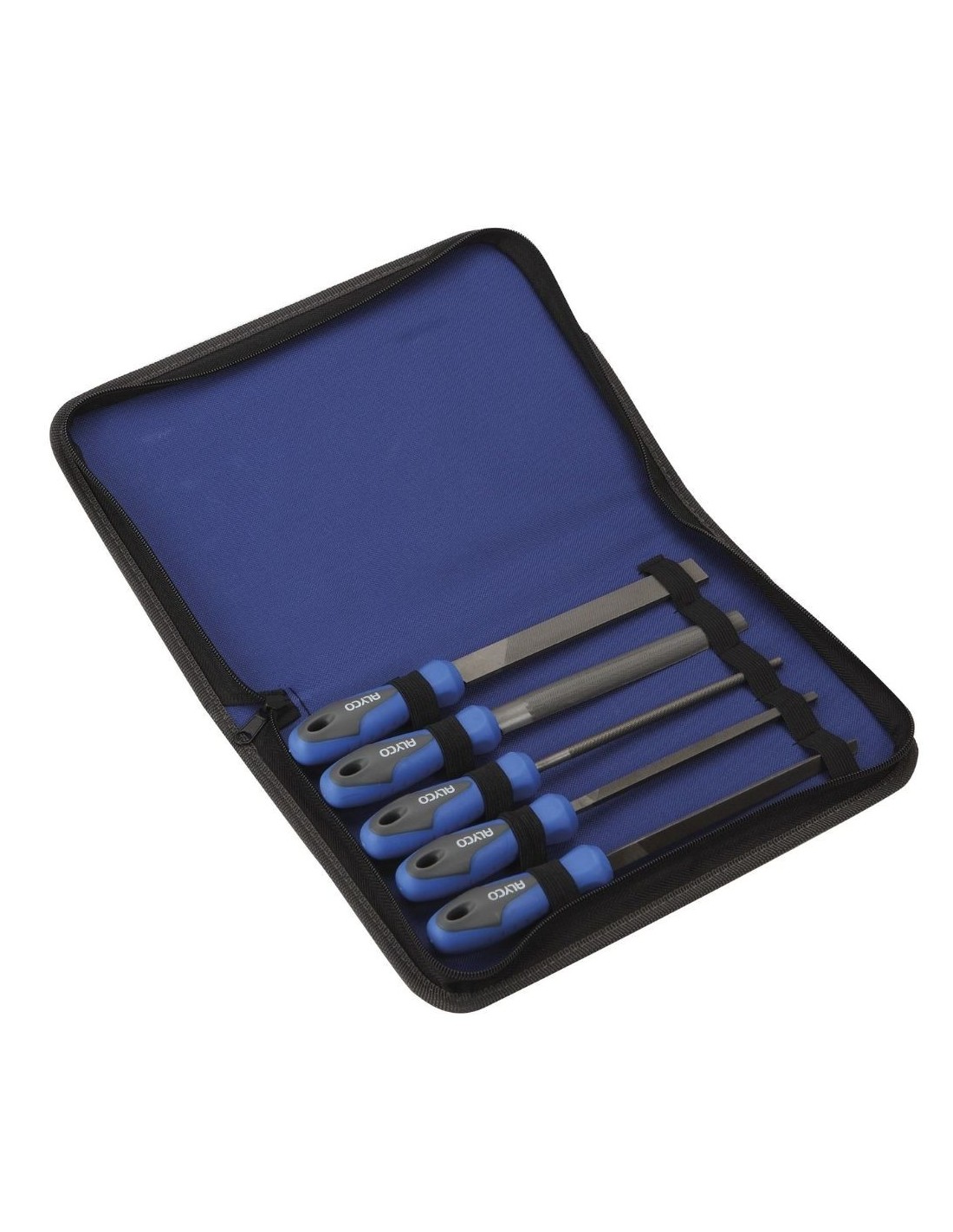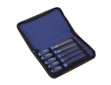 Juego de 5 limas de 150 mm para metal, plástico, cerámica y madera, con mango ergonómico bimaterial que facilita el agarre y hojas templadas de alto carbono para máxima dureza y resistencia, todo en un estuche de nylon; la unión entre hoja y mango está reforzada para evitar roturas y asegurar una larga durabilidad.