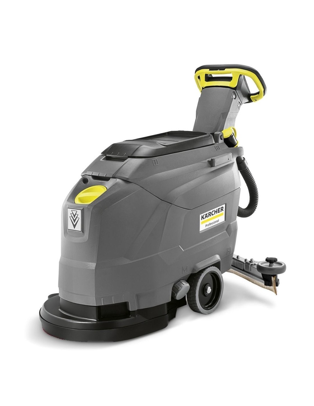 La fregadora-aspiradora BD 43/35 C Ep con alimentación de red (230 V/50 Hz) y tecnología de cepillos circulares de esponja no dispone de la opción de funcionamiento con batería, lo que resulta en un precio muy asequible del equipo. Técnicamente el equipo presenta el habitual equipamiento de alta calidad: destaca por su ancho útil de 43 centímetros, un depósito de 35 litros, una tobera en forma de V de 900 milímetros de largo y, gracias al sistema EASY Operation con sus característicos botones amarillos, el manejo resulta extremadamente sencillo. Además, es muy silenciosa y muy fácil de limpiar. La ágil BD 43/35 C Ep es idónea para superficies pequeñas y con muchos obstáculos de hasta 900 m². Además, sus dimensiones compactas posibilitan una visibilidad perfecta sobre la superficie a limpiar.