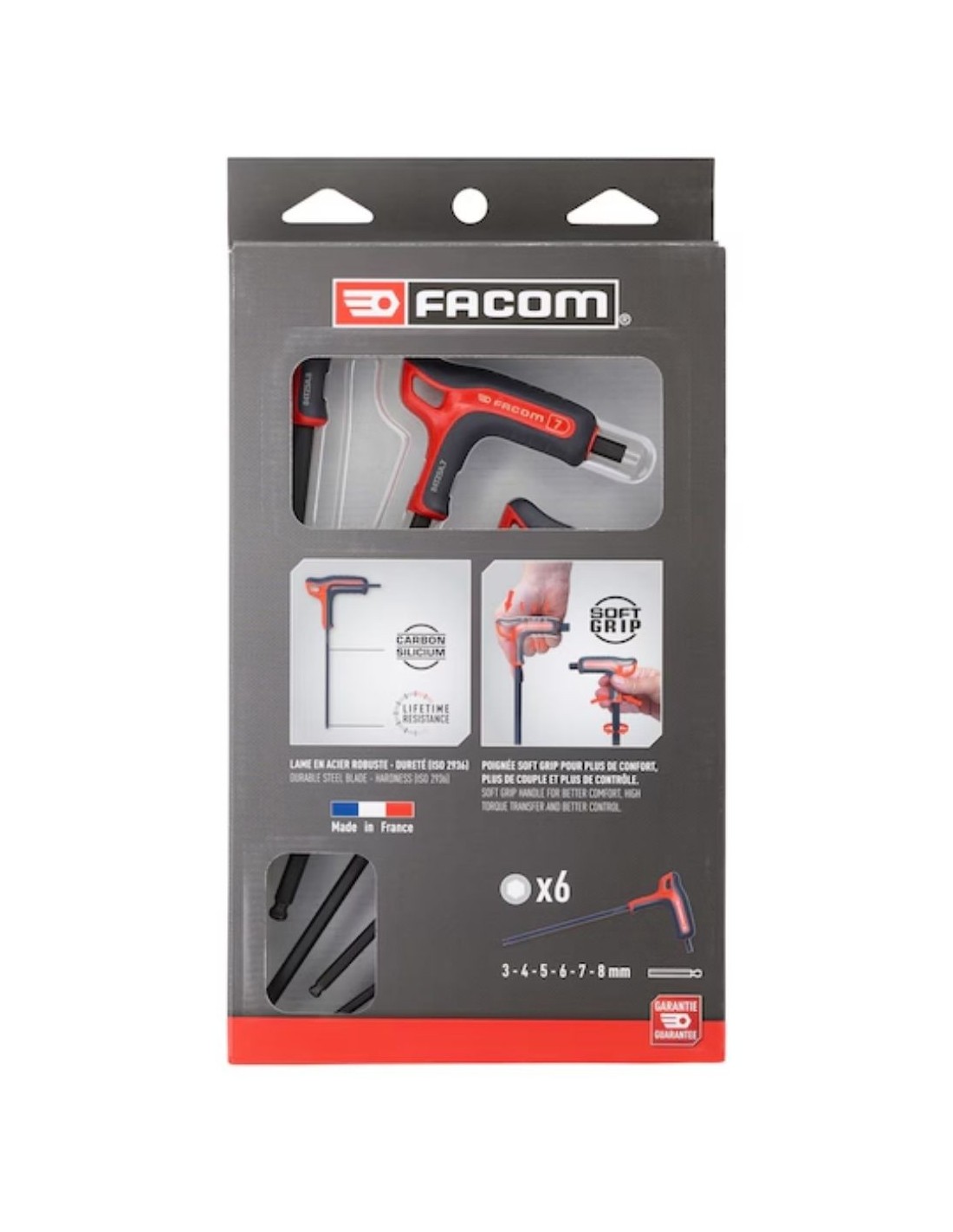 Llave con cabeza esférica fabricada en acero al carbono y silicio para una mayor vida útil, mango de agarre suave que proporciona mayor comodidad y permite aplicar más torque, y diseño de bola que facilita un atornillado rápido incluso con un ángulo de hasta 30°.