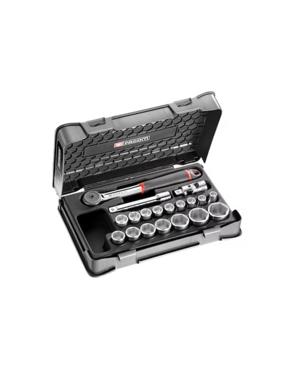 Contenido: 1 carraca sellada de alto rendimiento de 1/2" S.161B, 16 vasos métricos de 6 caras de 1/2" S.H en los tamaños 10 - 11 - 12 - 13 - 14 - 15 - 16 - 17 - 18 - 19 - 21 - 22 - 24 - 27 - 30 - 32 mm.