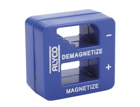 Magnetizador-desmagnetizador compacto, ideal para imantar herramientas como destornilladores y facilitar la captura de tuercas y tornillos. Mide 52x50x28 mm, con esquinas redondeadas que garantizan un manejo cómodo y transporte sencillo. Su uso es muy práctico: para magnetizar, se introduce la herramienta lentamente por el hueco marcado con (+), y para desmagnetizar, se repite el proceso por el hueco con (-). Fabricado con materiales de calidad, es una herramienta confiable y adecuada para uso profesional.
