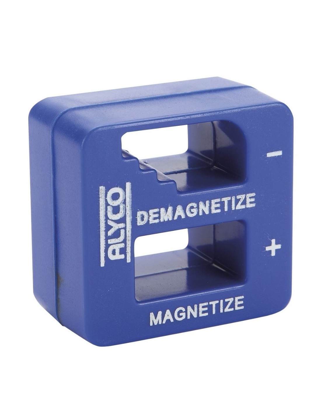 Magnetizador y desmagnetizador dos en uno para tornillos y tuercas, con diseño compacto que facilita su transporte y esquinas redondeadas para mayor comodidad de uso; fabricado en plástico resistente que soporta caídas, y con un proceso de magnetización sencillo y rápido.