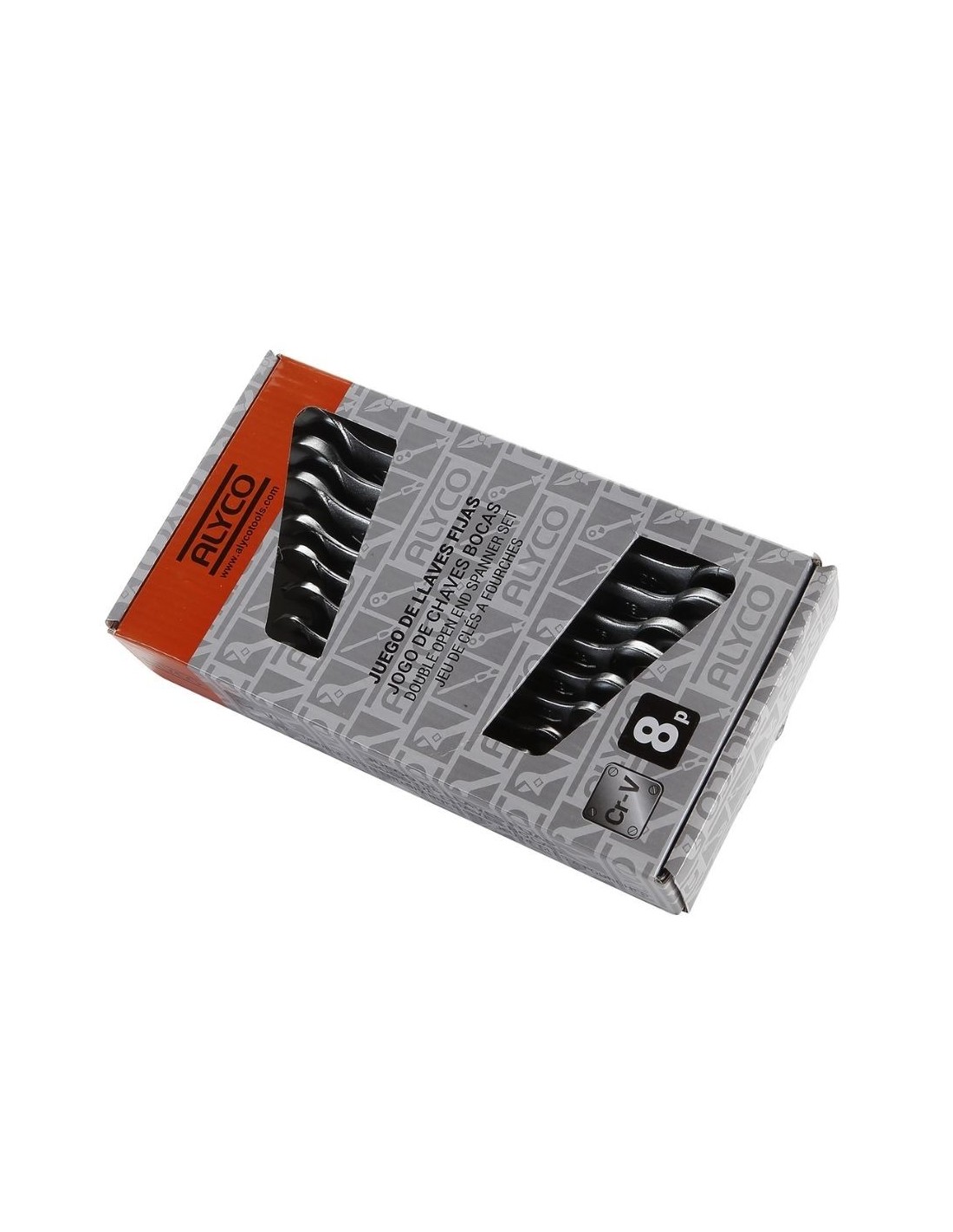 Juego de 8 llaves fijas de dos bocas, con medidas de 6x7 a 20x22 mm, presentadas en soporte plástico con colgador para fácil transporte y almacenamiento. Fabricadas en Acero al Cromo-Vanadio, forjadas de una sola pieza y endurecidas por tratamiento térmico, cuentan con acabado cromado que previene la oxidación y cabezas pulidas con satinado mate. Su acodado de 15° facilita el acceso a lugares difíciles, y cumplen la norma DIN 3110. Ideales para mantenimiento, fontanería, instalaciones y bricolaje, el soporte permite localizar rápidamente las llaves y controlar las que faltan.