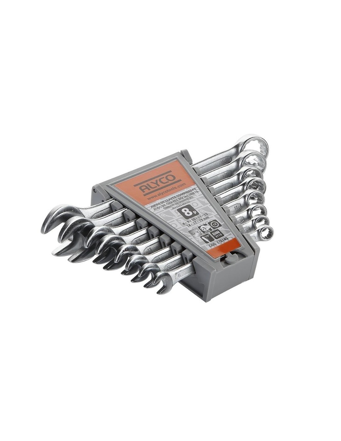 Juego de 8 llaves combinadas en Acero al Cromo-Vanadio, con soporte plástico para fácil transporte y almacenamiento. Cada llave tiene una boca abierta y otra de estrella con aristas redondeadas, fabricadas de una sola pieza, endurecidas por tratamiento térmico y cromadas para evitar la oxidación, cumpliendo la norma DIN 3113. Presentan cabezas pulidas y satinado mate, con bocas inclinadas 15° para facilitar el acceso y apriete en espacios difíciles. Medidas incluidas: 8, 9, 10, 11, 13, 14, 17 y 19 mm. El soporte plástico permite localizar rápidamente las llaves, controlar las faltantes y colgar el juego para mayor comodidad. Ideal para trabajos en industria, mecánica, mantenimiento, fontanería e instalaciones.