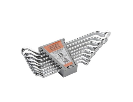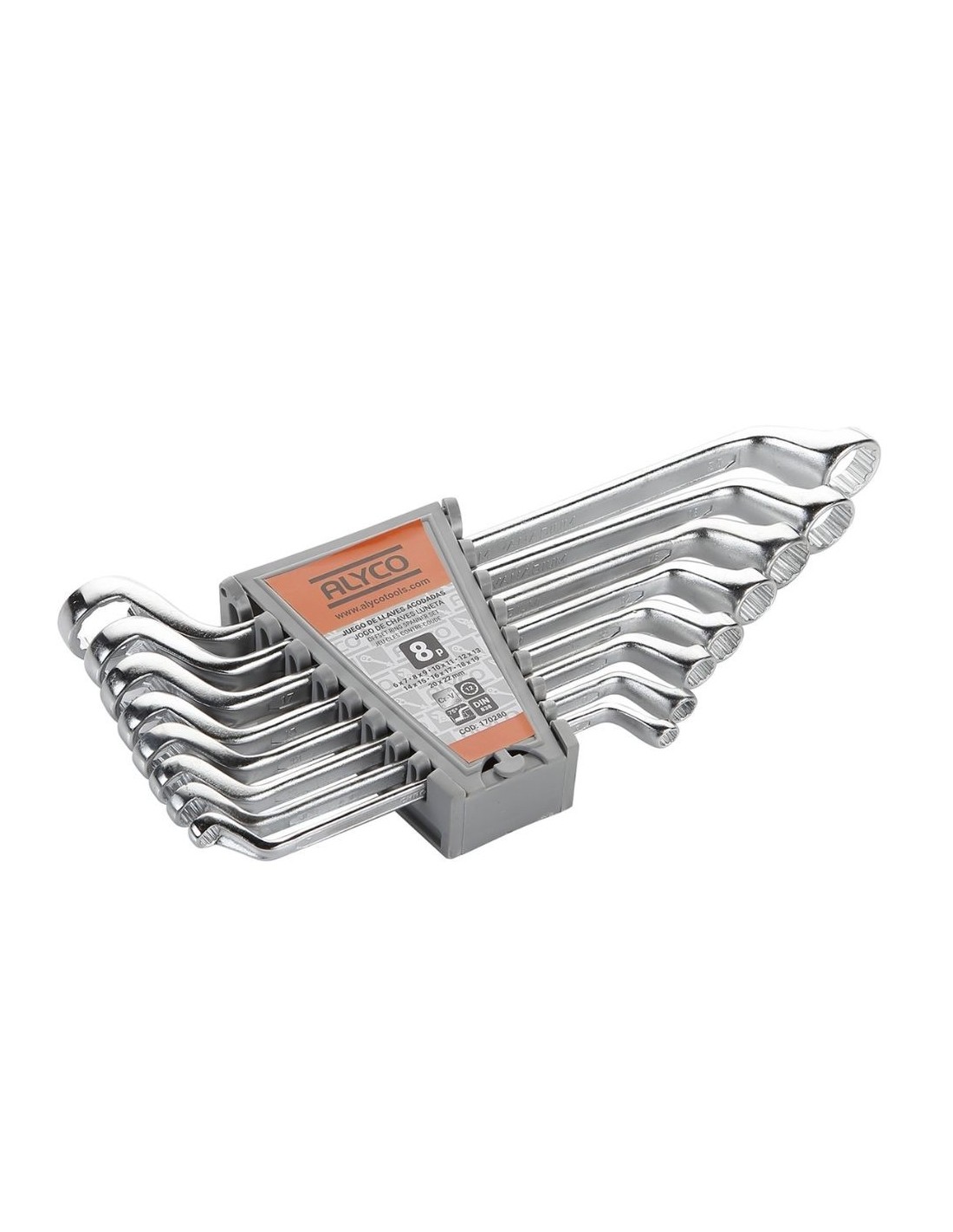 Juego de 8 llaves de doble estrella acodada con un ángulo de 75°, en medidas desde 6x7 hasta 20x22 mm, fabricadas en Acero al Cromo-Vanadio forjado de una sola pieza y endurecidas por tratamiento térmico, con acabado cromado que evita la oxidación y cabezas pulidas con satinado mate; cumplen la norma DIN 838 y cuentan con un diseño acodado para facilitar el acceso a lugares difíciles, presentadas en un soporte plástico con colgador que permite su transporte, almacenamiento y control rápido, siendo ideales para mantenimiento, fontanería, instalaciones y bricolaje.