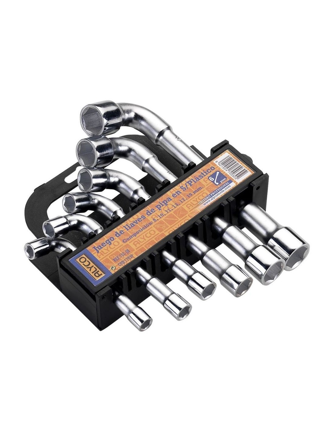 El juego de 6 llaves de apriete incluye llaves de pipa de dos bocas abiertas, con medidas de 10 a 19 mm, presentadas en un soporte plástico colgable que se abre con seguro y permite su exposición, facilitando la localización, identificación y organización en el taller; las llaves están fabricadas en acero al cromo-vanadio, forjadas de una sola pieza, endurecidas por tratamiento térmico y cromadas para evitar oxidación, con cuerpo cilíndrico reforzado en el acodamiento para mayor capacidad de apriete, bocas hexagonales de seis caras con orificio para tuercas roscadas pasantes y diseño que supera la norma DIN 691, ofreciendo elasticidad para evitar roturas, seguridad y larga vida útil, presentadas con cabezas pulidas y cromado satinado mate, y bocas con chaflán para facilitar el encaje en la tuerca, siendo ideales para aprietes en industria pesada, mecánica, mantenimiento, fontanería e instalaciones.