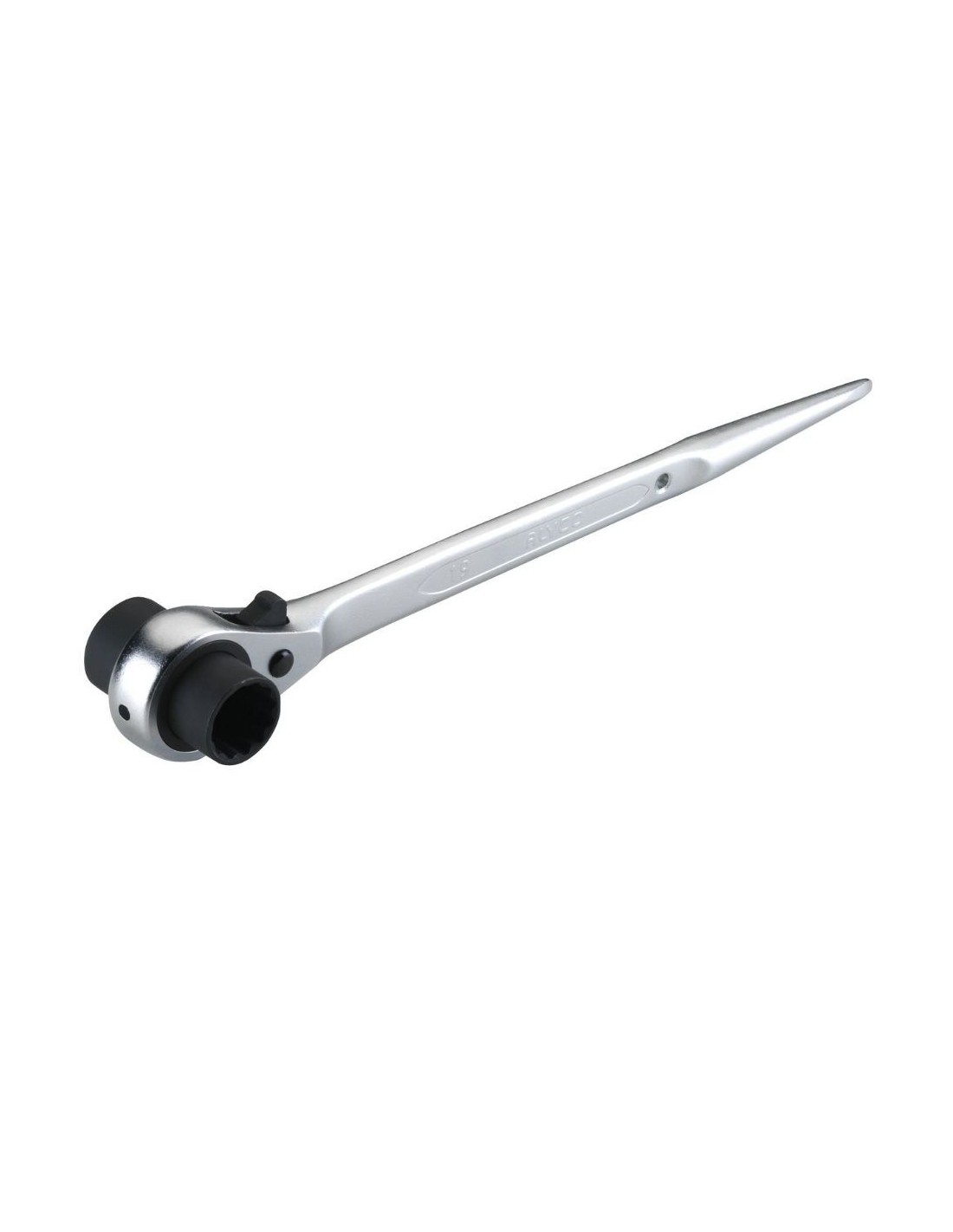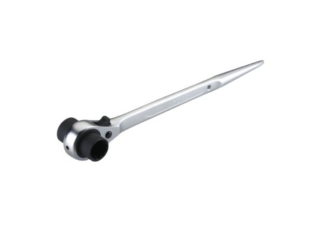 La llave para montaje y desmontaje de andamios, conmutable para diestros y zurdos y medida 19/22 mm, está fabricada en acero Cr-Mo, templada en su totalidad, con bocas pavonadas y acabado en satinado mate.