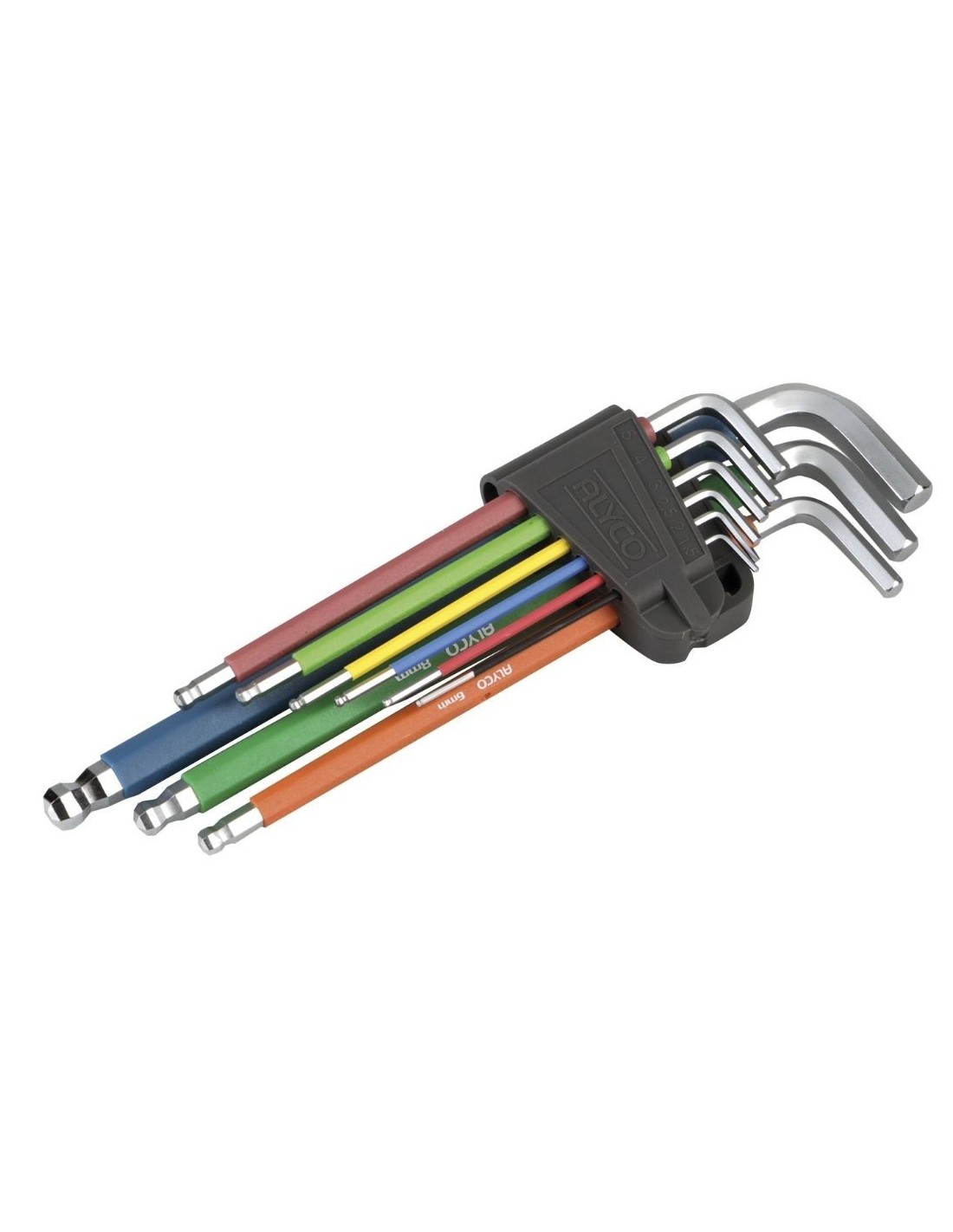 Juego de 9 llaves acodadas hexagonales Allen con punta larga de forma de bola de diamante, fabricadas en Acero al Cromo-Vanadio S2 para una gran durabilidad y resistencia al desgaste. Los extremos imantados facilitan la recuperación de tuercas sueltas, mientras que el perfil de diamante ofrece mayor superficie de contacto para aplicar más fuerza sin dañar la pieza. Cuentan con recubrimiento rugoso antideslizante que mejora la ergonomía y comodidad. Se presentan en un soporte de goma de una sola pieza para almacenamiento ordenado, con las medidas marcadas para fácil identificación. Medidas incluidas: 1.5 mm, 2 mm, 2.5 mm, 3 mm, 4 mm, 5 mm, 6 mm, 8 mm y 10 mm.