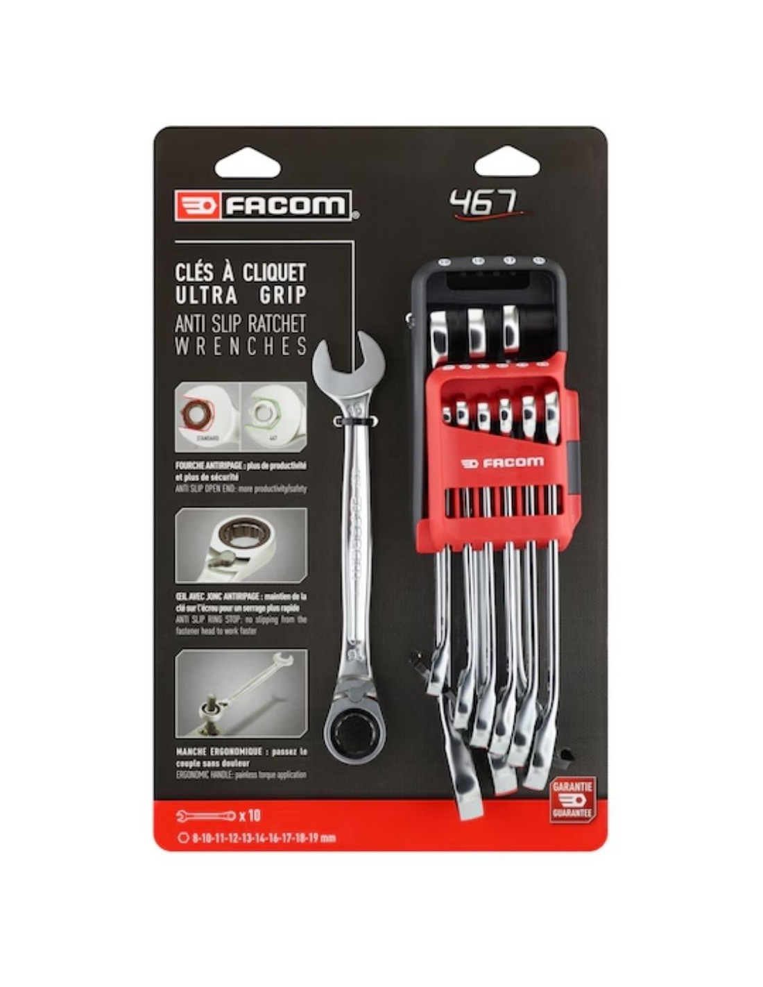 Alto rendimiento: mecanismo de 72 dientes con alto rendimiento mecánico combinado con un diseño compacto que cumple con las normas aeronáuticas; perfil OGV® y tope en anillo que maximizan el contacto entre la llave y la tuerca/torno para preservar los sujetadores, bloqueando la tuerca en el extremo de anillo para un apriete más eficiente; desplazamiento de 15° que ofrece mejor maniobrabilidad y permite evitar ciertos obstáculos.