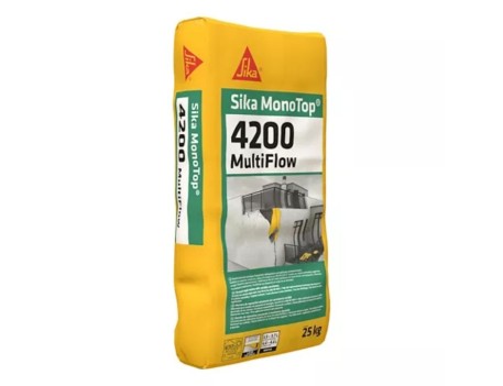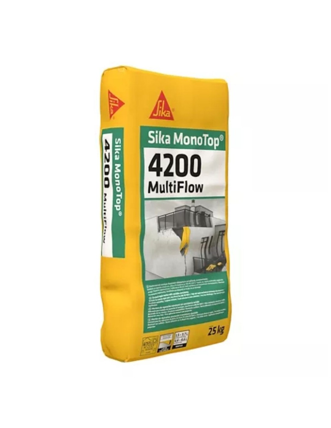 Sika MonoTop®-4200 Multi Flow es un mortero que debe ser utilizado únicamente por personal especializado y resulta adecuado para trabajos de reparación de hormigón conforme al Principio 3, métodos 3.1, 3.2 y 3.3 de la UNE-EN 1504-9, permitiendo la restauración de desconchones y deterioros en edificios, puentes, infraestructuras y superestructuras; también es apto para el refuerzo estructural del hormigón según el Principio 4, método 4.4, al incrementar la capacidad portante de las estructuras mediante la adición de mortero, así como para la conservación o restauración del pasivado de acuerdo con el Principio 7, métodos 7.1 y 7.2, mediante el aumento del recubrimiento con mortero adicional o la sustitución del hormigón contaminado o carbonatado. Puede emplearse en reparaciones de estructuras de hormigón armado que requieran un mortero de Clase R4, R3, R2 o R1, tanto en aplicaciones verticales, horizontales como en techos. Entre sus ventajas destacan las altas resistencias iniciales y finales a compresión, la resistencia a sulfatos, la buena adherencia sobre soportes de hormigón, mortero, piedra y ladrillo, la resistencia a la abrasión, la muy baja contracción, el buen acabado superficial, su presentación lista para mezclar únicamente con agua, la excelente trabajabilidad, la posibilidad de aplicación manual o mediante proyección húmeda, su alto pH que protege la armadura y el hecho de no contener cloruros ni aditivos que promuevan la corrosión.