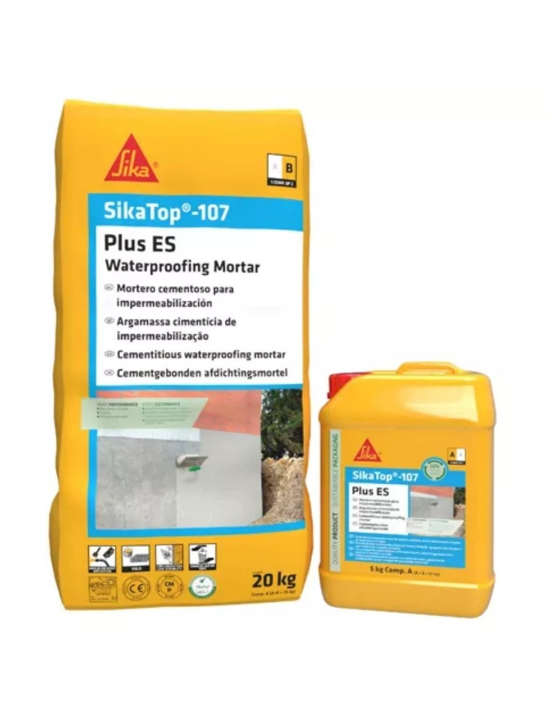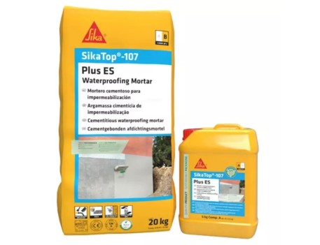 SikaTop®-107 Plus ES se utiliza para la impermeabilización interior y exterior de estructuras de hormigón, mortero, bloques de hormigón o ladrillo, incluyendo muros de cimentaciones o enterrados en obra nueva y rehabilitación, así como para la protección de estructuras de hormigón frente a sales de deshielo y efectos de hielo-deshielo, como tapaporos, para el puenteo de fisuras en estructuras de hormigón no sometidas a movimiento y para la impermeabilización de depósitos de agua potable y no potable. Entre sus ventajas destacan la protección contra la penetración de agua líquida, la capacidad de transmitir vapor de agua, la fácil aplicación con llana o brocha, el uso de componentes predosificados que no requieren añadir agua, la posibilidad de aplicación manual o mediante proyección, el fácil y rápido mezclado, que no corroe el acero ni el hierro, y que es repintable y apto para cubrir.