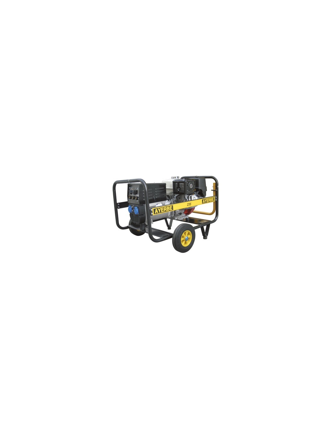 Generador Ayerbe 3000H MN motor Honda GP160 5.5CV. 3KVA máx/2.4KVA nominal. 230V 50Hz, arranque manual. Depósito 3.1L, autonomía 2.8h. Peso 47kg.