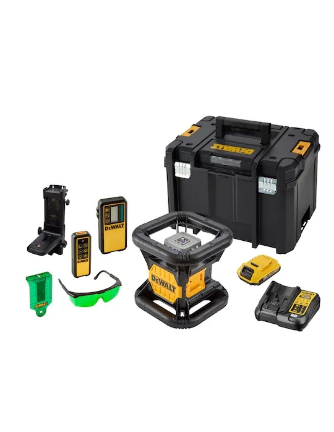 Nivel láser verde rotativo DEWALT con nivelación totalmente automática tanto en superficies horizontales como verticales dentro de un rango de ±5°, sellado con clasificación IP67 que lo protege contra el polvo y el agua, ideal para trabajos exigentes en obras y exteriores.