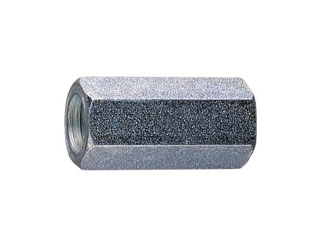 Manguito hexagonal de unión, con rosca interior métrica. Está diseñado para unir varillas roscadas u otros elementos roscados como tornillos entre sí. Permite ampliar su alcance en el montaje de instalaciones suspendidas u otro tipo de montajes. Está fabricado en acero con recubrimiento zincado.