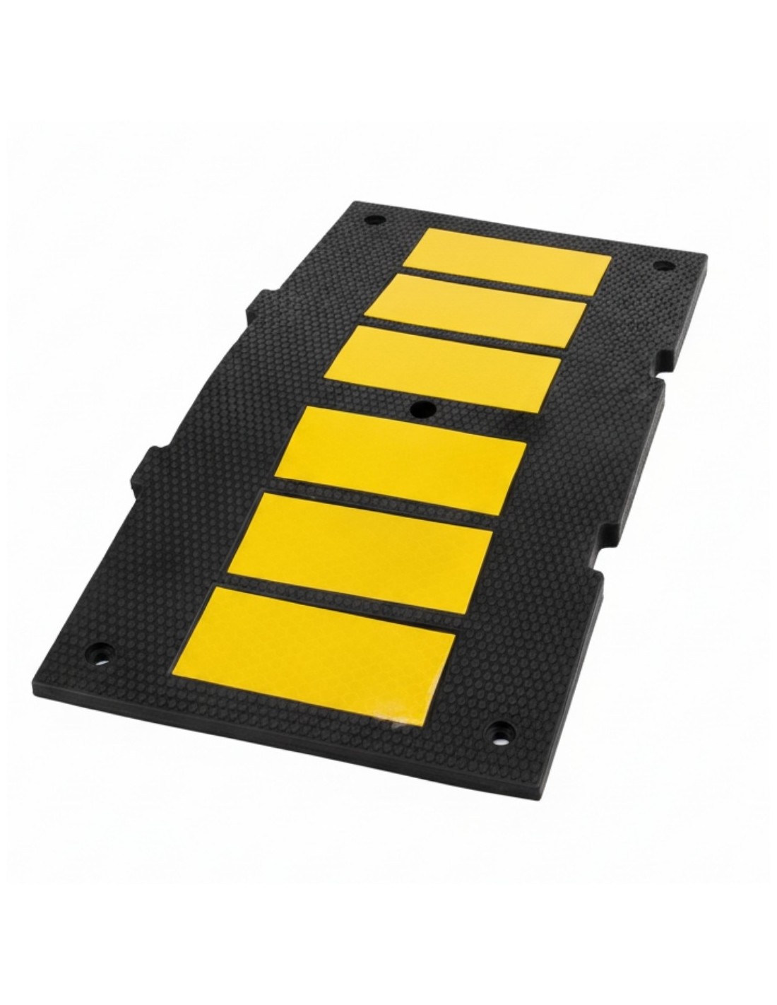 Su efectividad radica en crear una desaceleración vertical en los vehículos al atravesar los dispositivos, generando incomodidad a conductores y ocupantes si se circula a velocidades superiores a las establecidas; es un producto ecológico y respetuoso con el medio ambiente, de gran robustez, mínima contaminación acústica, buena absorción de impactos, alta resistencia a la abrasión, ozono y rayos UV, y de fácil instalación mediante tornillería.