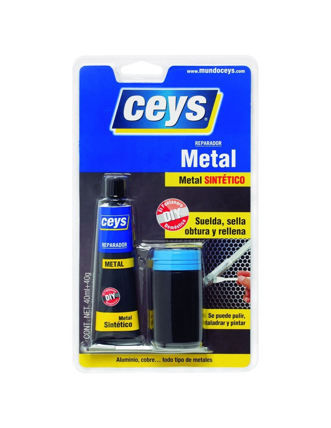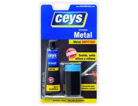 Reparador de metal CEYS en blister, ideal para arreglos en metal, madera y plástico. Resistente y fácil de usar, perfecto para bricolaje y reparaciones.