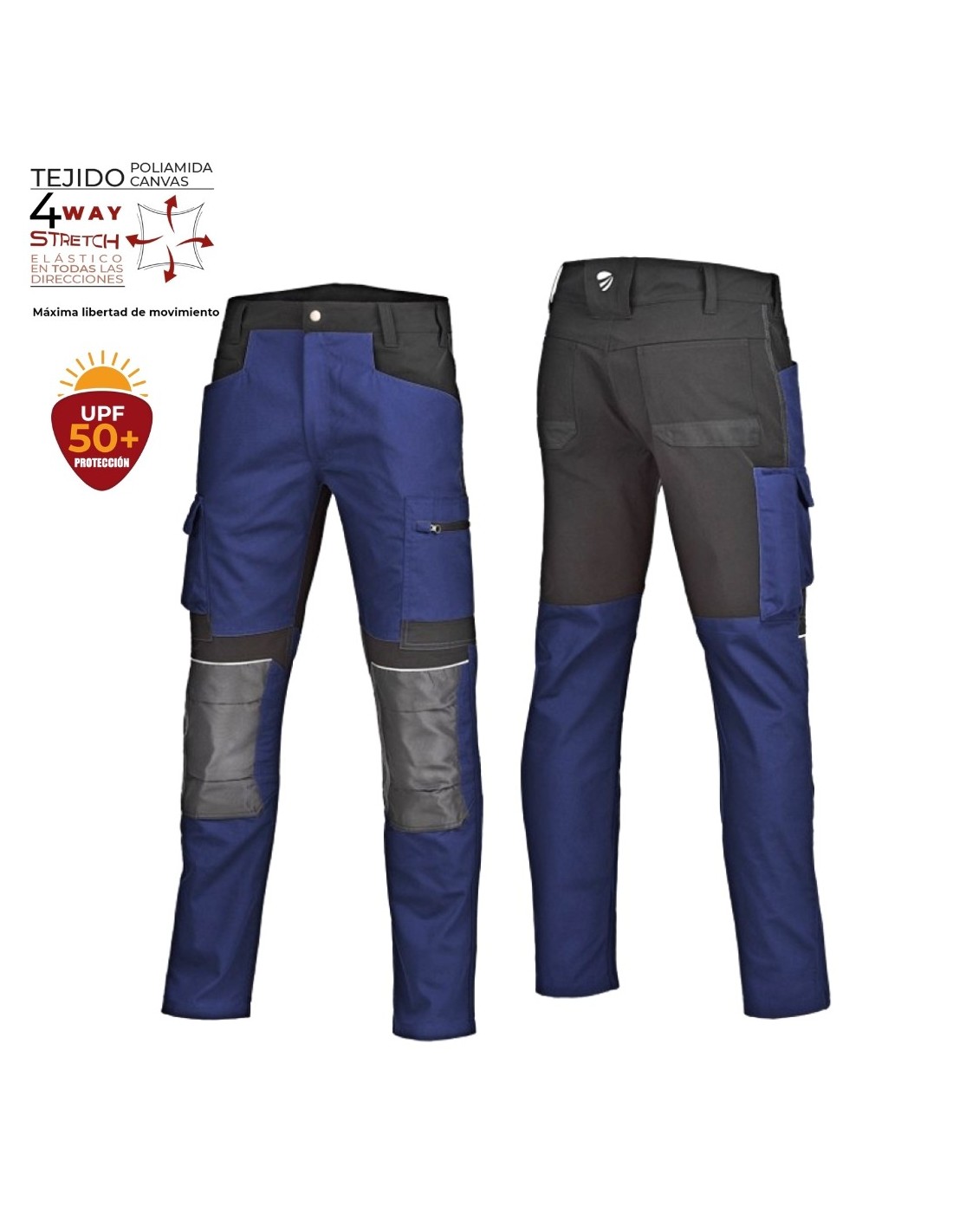 Pantalón PROWORK Profesional 4 WAY STRETCH OEKO-TEX MARINO - Te mueves en cualquier dirección sin límites gracias a su tejido negro 95% poliamida y 5% elastano que se estira hacia los 4 lados. El tejido principal PROWORK de 260g aguanta el trabajo más duro, mientras que los refuerzos Oxford 100% poliéster impermeables protegen donde más lo necesitas.