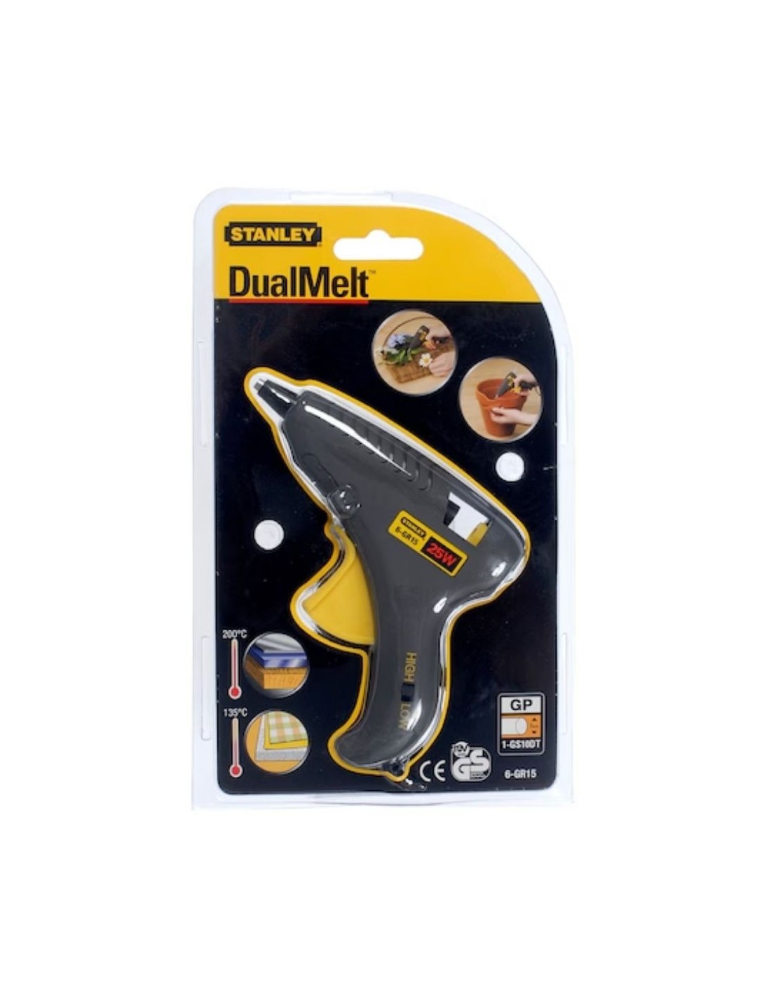 Pistola cola termofusible Stanley DualMelt GR15 Mini 15W fuente alimentación alámbrica ideal hobbies manualidades reparaciones. Botón selección temperatura 210° o 135° utiliza barras cola pequeñas 7mm diámetro soporte extraíble. Altura producto 110mm longitud 120mm peso 0.19kg ancho 30mm embalaje ampolla. Herramienta manualidades bricolaje hogar reparaciones pequeñas pegado materiales diversos temperatura regulable precisión control trabajos delicados artesanía decoración scrapbook modelismo educativo creatividad.