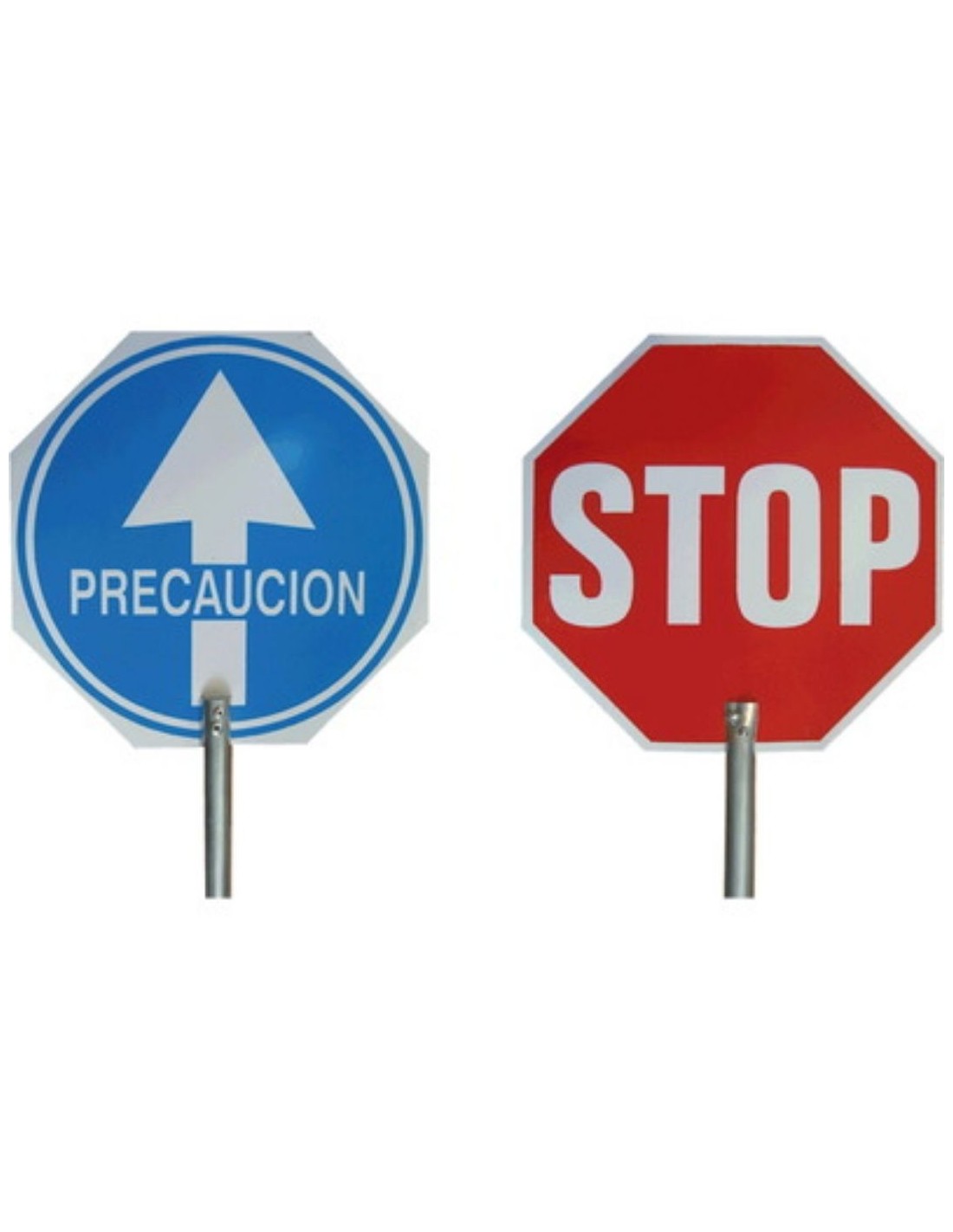 Se trata de un octágono de 30 cm con serigrafía a dos caras sobre vinilo réflex N1 mostrando "Dirección Obligatoria" y "STOP", con mango de aluminio remachado, diseñado para dirigir la circulación en tramos de obras, cruces o entradas y salidas de camiones.