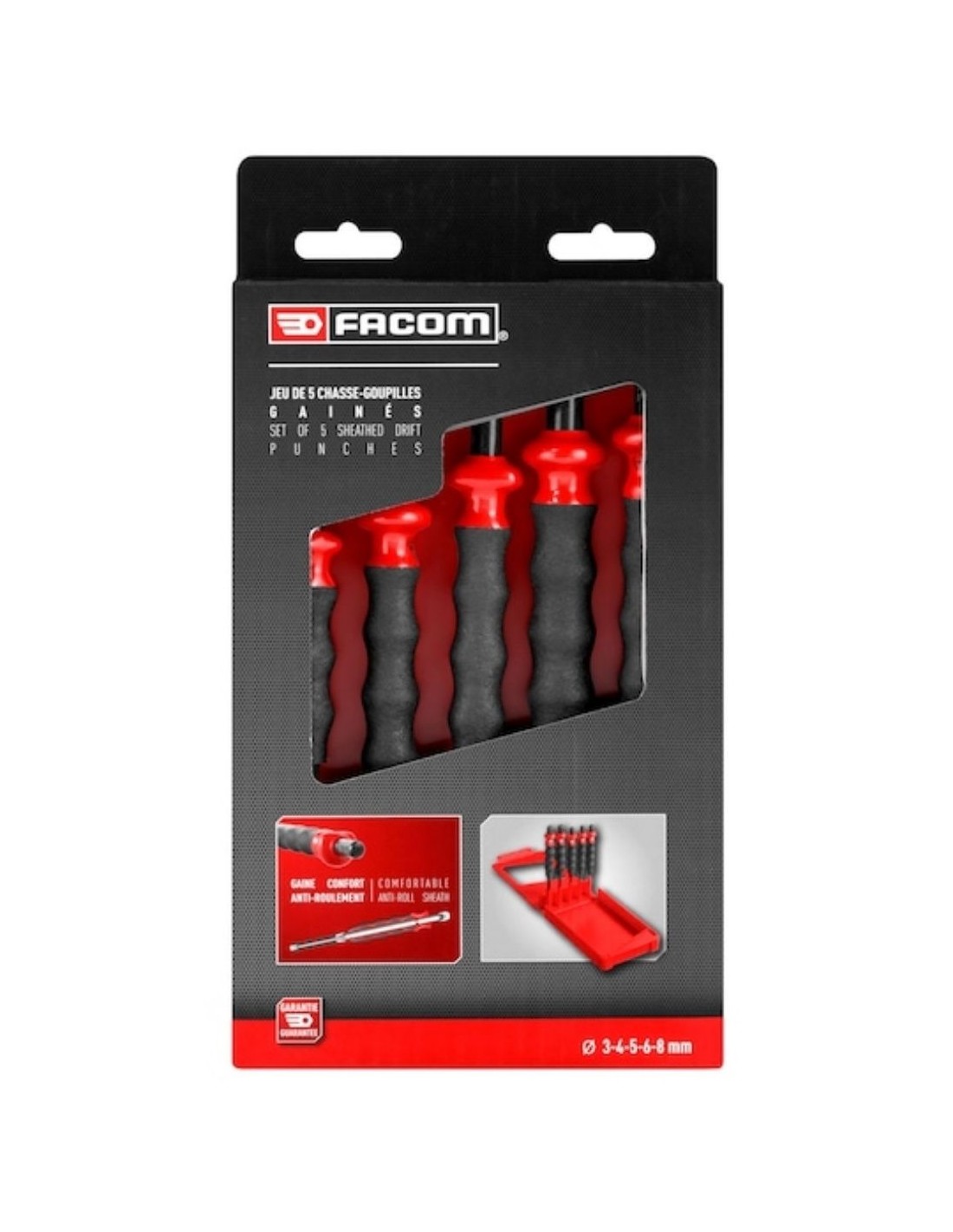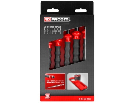 Juego de 5 punzones con funda que incluye punzones de deriva de 3 mm, 4 mm, 5 mm, 6 mm y 8 mm, fabricados con eje largo en acero de alto rendimiento para una mayor resistencia y durabilidad en aplicaciones exigentes.