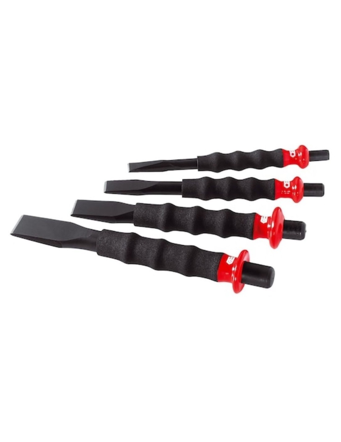 Juego de cinceles de capa de 4 piezas con funda absorbente de impactos para mayor comodidad del usuario al golpear, suministrado en caja de cartón para un almacenamiento práctico y protegido.