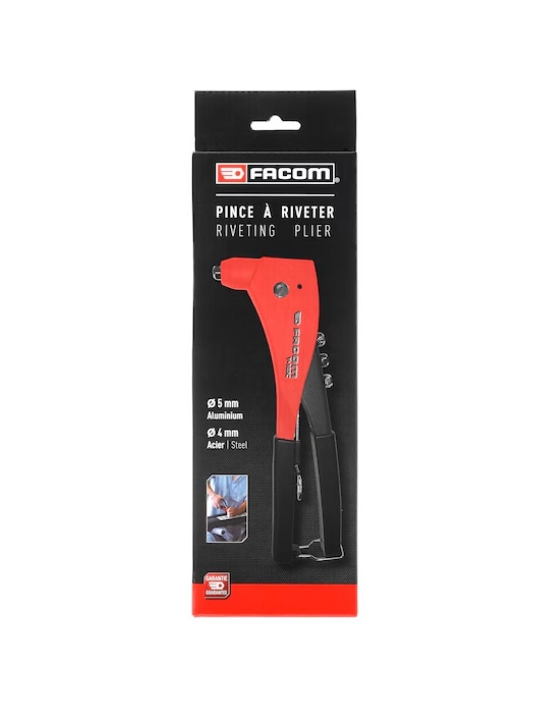 Compatible con remaches de acero de 3,2 mm y 4 mm de diámetro, cuenta con posición de apertura con resorte y clip de retención para un almacenamiento fácil.