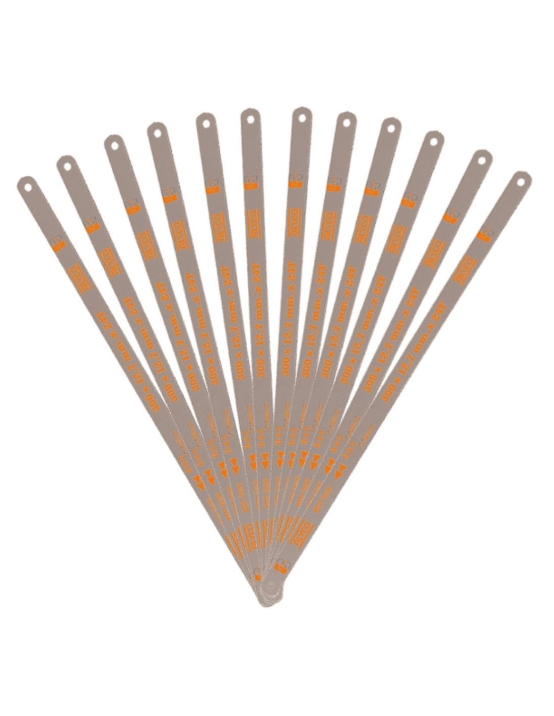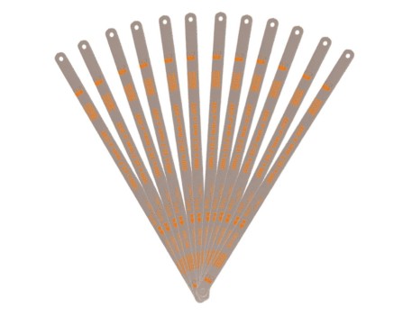 Hoja de sierra fabricada en acero aleado con filo de corte dentado; paquete de 12 unidades; ajustable a arco de sierra ALYCO ORANGE; adecuada para cortar metal, madera y plástico.