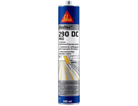 Sikaflex®-290 DC PRO se utiliza para calafatear juntas en cubiertas de madera tradicionales en construcciones de barcos, yates y naves comerciales, siendo adecuado únicamente para usuarios profesionales con experiencia y requiriendo pruebas previas en los sustratos y condiciones reales para garantizar adherencia y compatibilidad; entre sus ventajas destacan excelente resistencia a la intemperie, robustez y durabilidad, fácil y rápida preparación para lijado, fluencia ideal para la aplicación, amplia alisabilidad, aspecto único y resistencia al agua de mar y dulce.