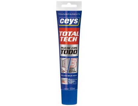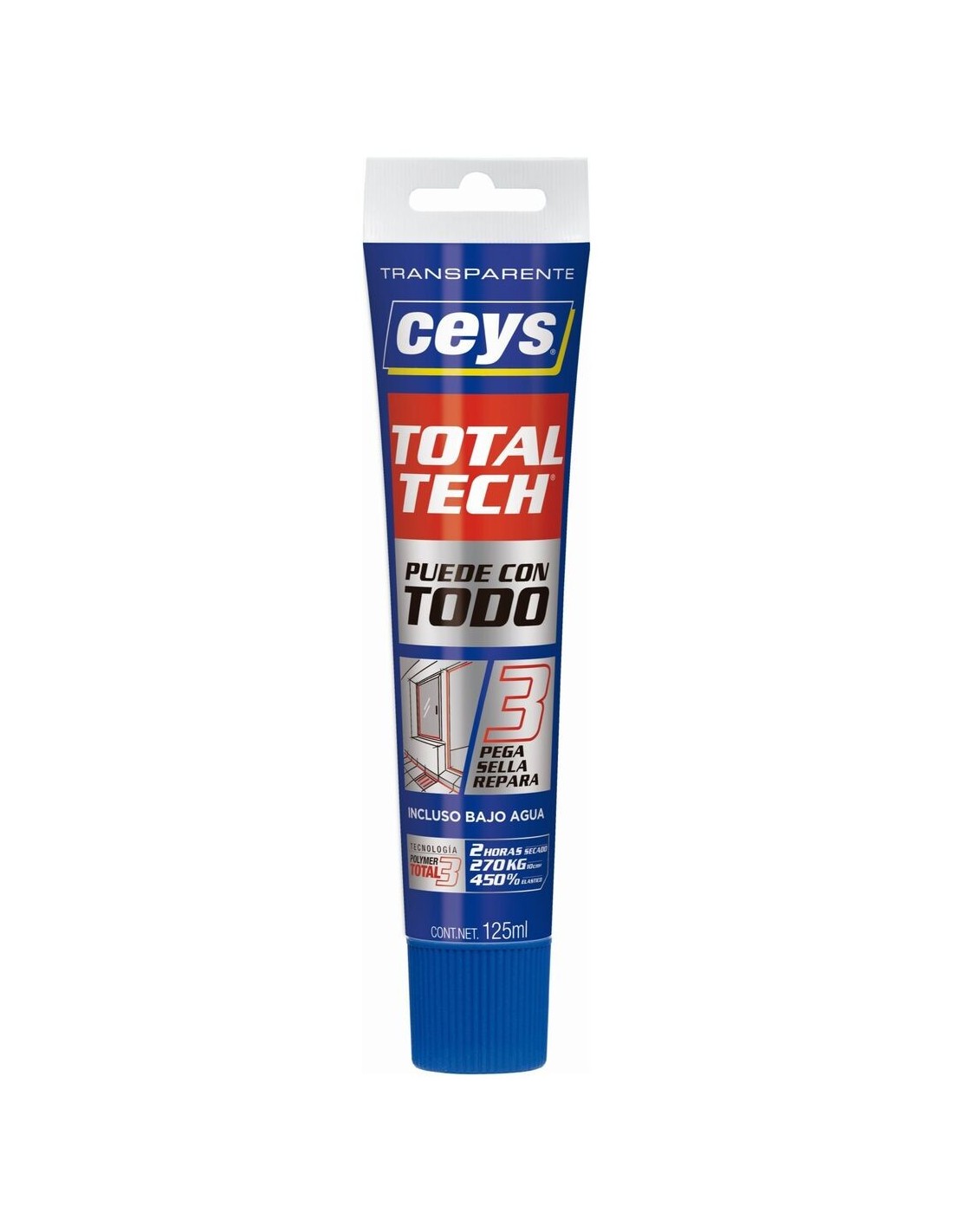 Adhesivo transparente Ceys Total Tech en tubo de 125ml, perfecto para unir, reparar y sellar todo tipo de materiales como madera, metal y plástico. Su fórmula de secado rápido garantiza un agarre fuerte y duradero, ideal para trabajos en el hogar o proyectos de bricolaje. Fácil aplicación gracias a su práctico tubo, es la solución perfecta para quienes buscan calidad y eficiencia en sus reparaciones.