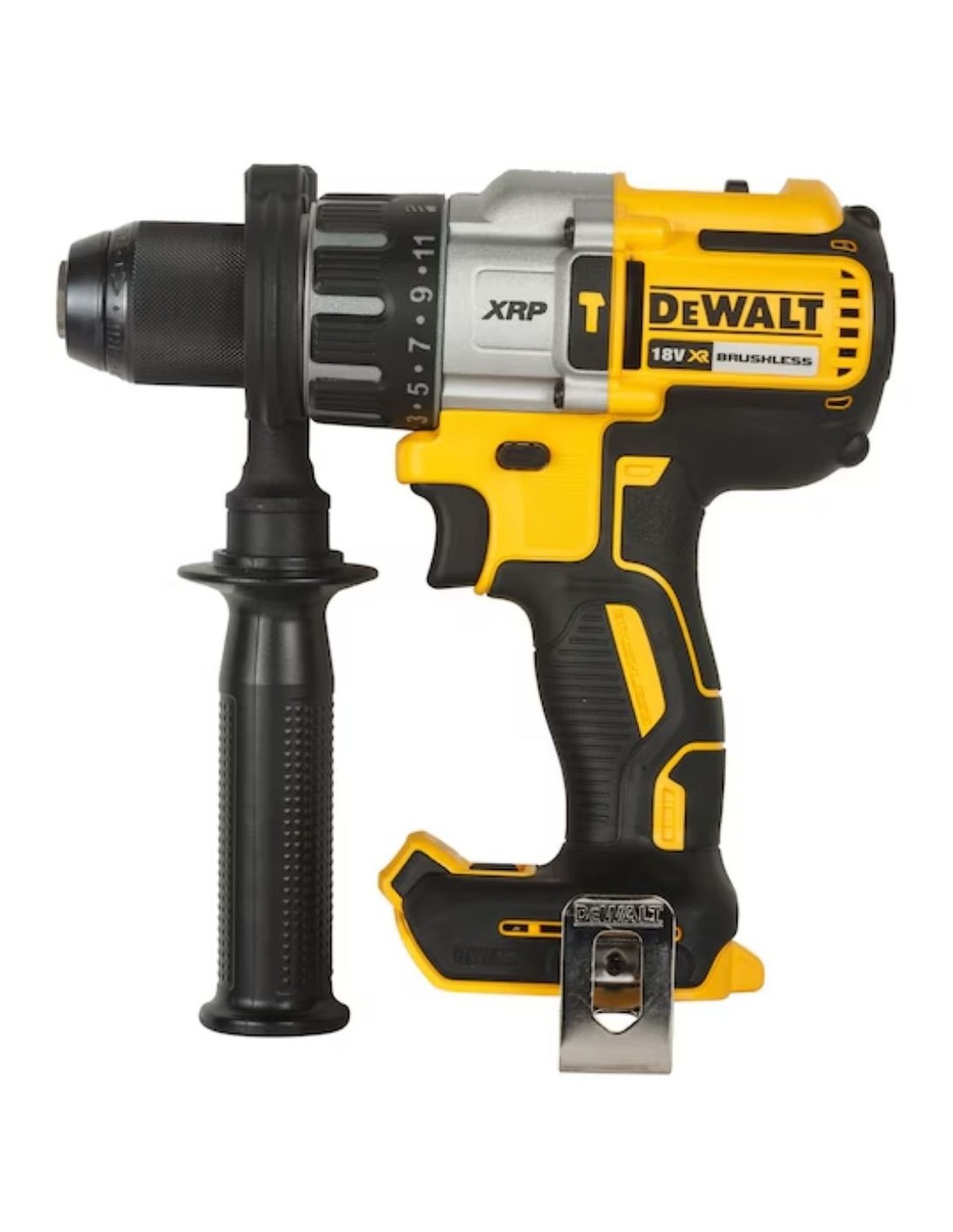 Última generación XRP sin batería ni cargador. El DCD996NT combina motor brushless con transmisión metálica completa de 3 velocidades para máxima autonomía. Su embrague electrónico de 11 posiciones, portabrocas auto-apriete 13mm y gatillo inteligente ofrecen control total, mientras que la luz LED de 3 intensidades mejora visibilidad.