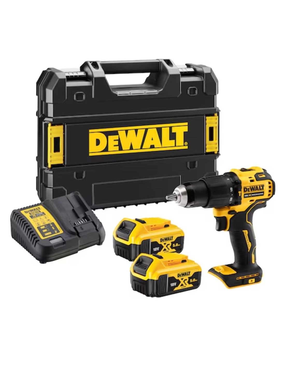 Taladro percutor DEWALT XR 18V brushless ultra compacto 175mm. Kit 2 baterías 5Ah, par 65Nm, LED pie, gancho cinturón. Peso 1.2kg sin batería.