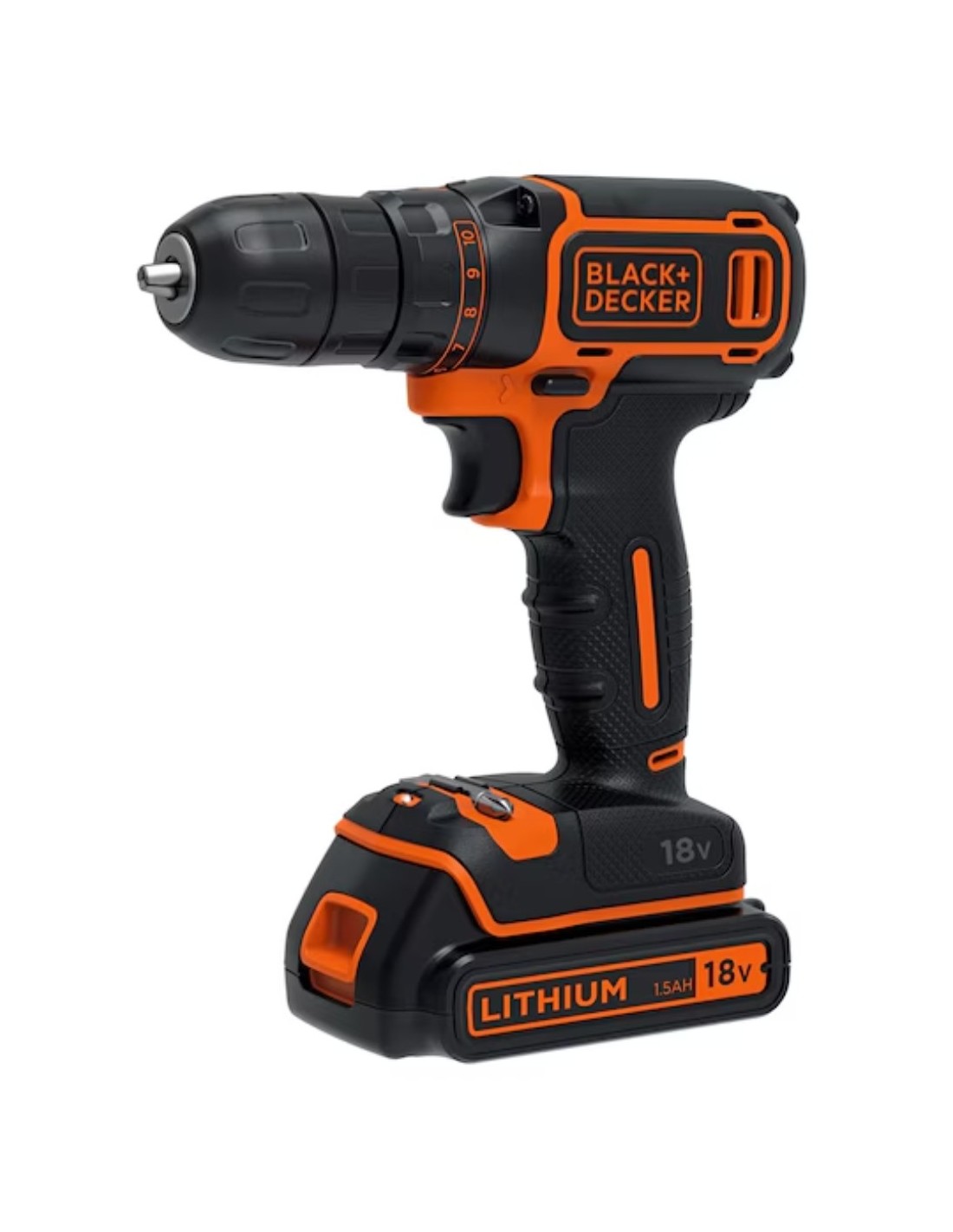 Taladro atornillador BLACK+DECKER 18V litio par 30Nm. Kit 2 baterías 1.5Ah, portabrocas 10mm, 11 posiciones embrague. Cargador maletín incluido.