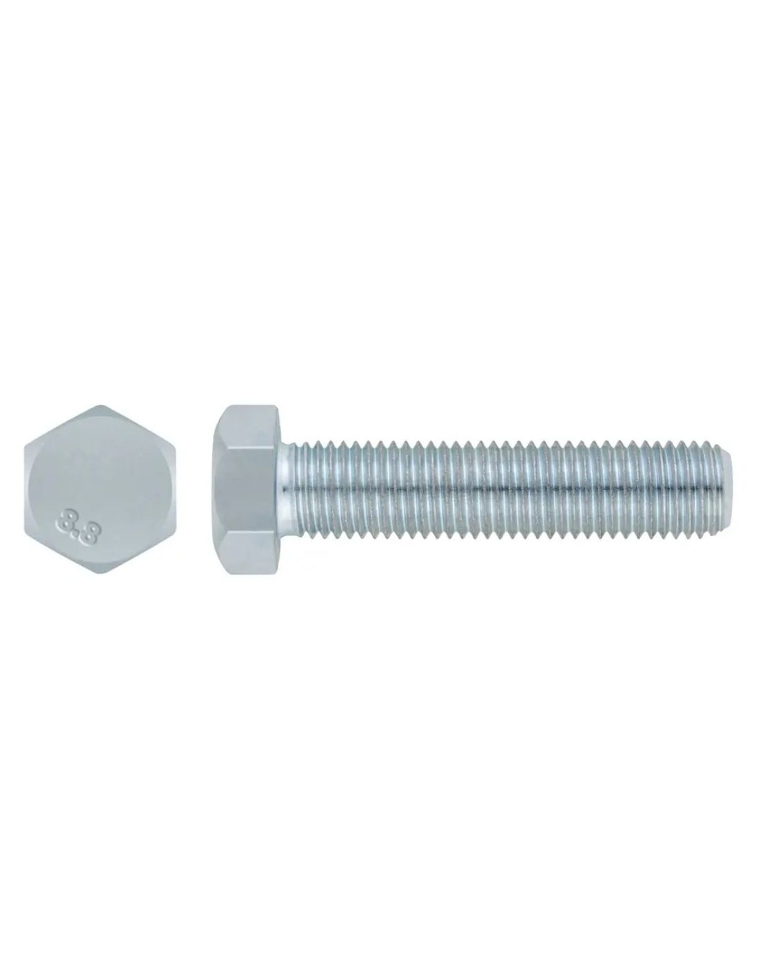 Tornillo DIN-933, con cabeza hexagonal y rosca métrica completa. Se puede emplear en la unión de chapas metálicas entre sí o para ensamblar piezas de madera, entre otros usos. Está fabricado en acero con recubrimiento zincado de calidad 8.8.