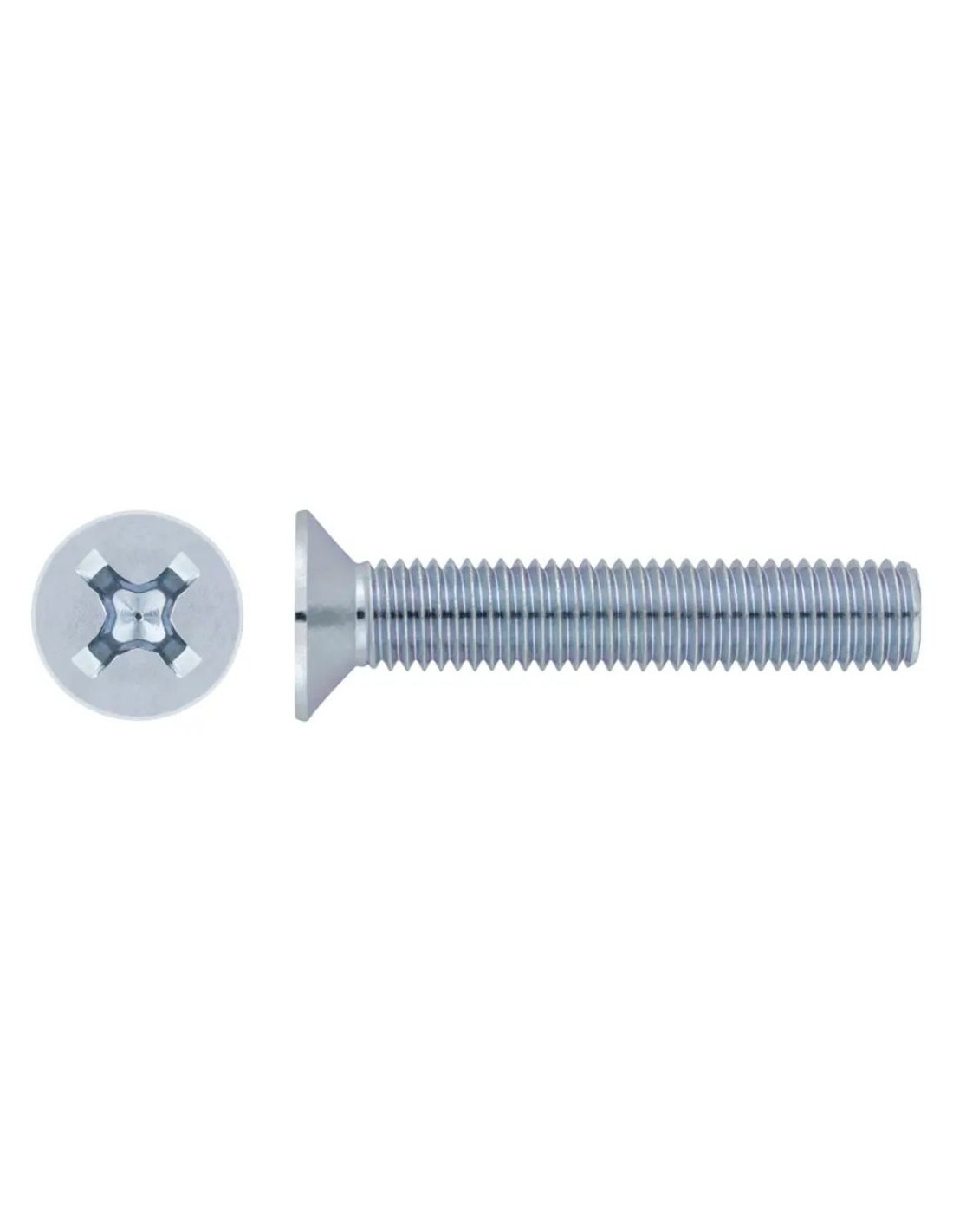 Tornillo DIN-965, con cabeza avellanada, huella ranurada y rosca métrica completa. Se puede emplear para fijar chapas entre sí o para unir piezas en el montaje de maquinaria, entre otros usos. Su cabeza avellanada permite que el tornillo quede a ras de la superficie tras la instalación. Está fabricado en acero con recubrimiento zincado de calidad 4.8.