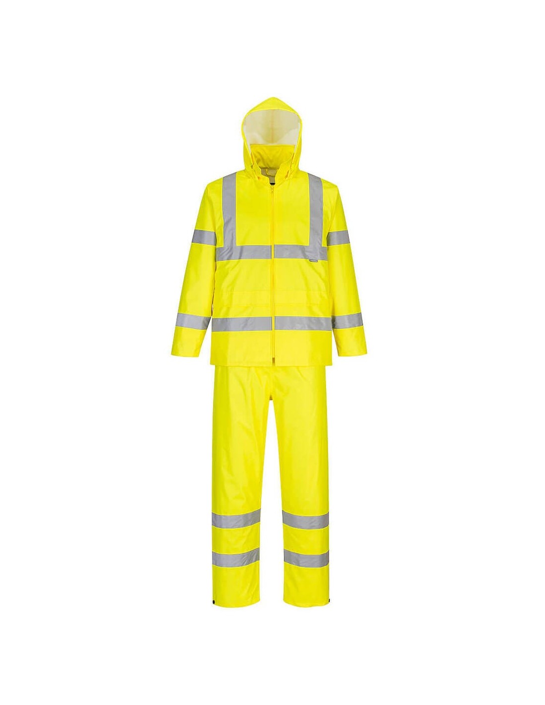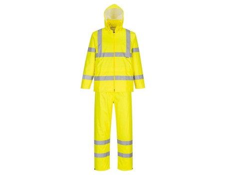 Traje de agua Portwest amarillo de alta visibilidad, perfecto para trabajos en exteriores. Protección garantizada contra lluvia y condiciones adversas.