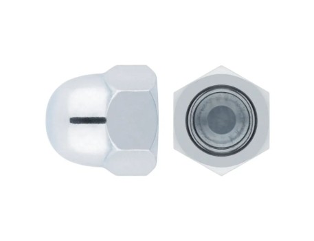 Tuerca ciega DIN-1587, con cuerpo hexagonal. Permite asegurar uniones con tornillos normalizados en tareas como el ensamblaje de chapas o el montaje de maquinaria. Incorpora una parte superior cerrada que oculta el tornillo, mejorando la estética de las uniones y protegiendo el anclaje. Está fabricada en acero con recubrimiento zincado.