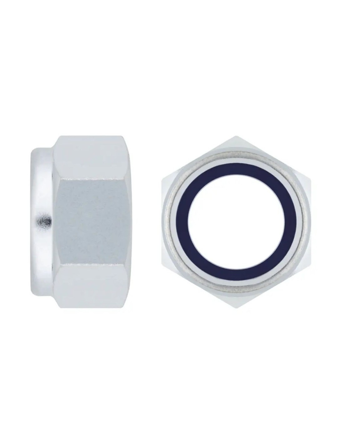 Tuerca autoblocante DIN-985. Su estructura hexagonal incorpora una arandela interior que refuerza las uniones con tornillos normalizados. Es ideal para conexiones sometidas a vibraciones. Está fabricada en acero zincado.
