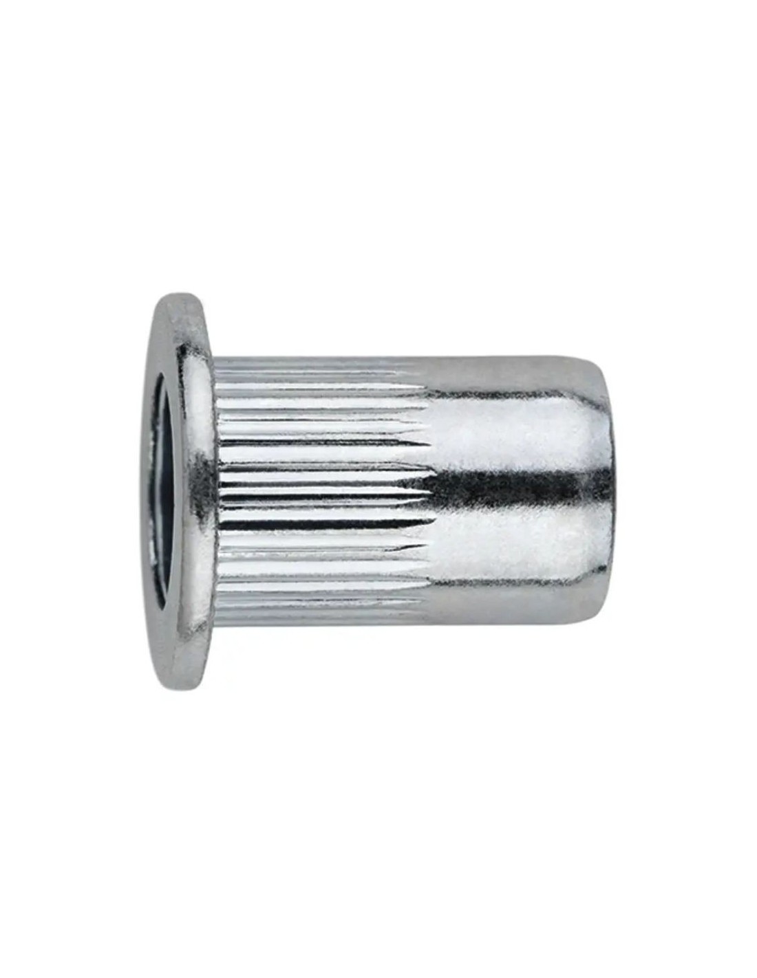 Tuerca remachable con cabeza ancha. Permite crear fácilmente un punto de roscado para ensamblar dos elementos entre sí. La forma de su cabeza ofrece una mayor superficie de contacto que en modelos estándar, ofreciendo una fijación más resistente. Cuenta con estrías para mejorar la resistencia al giro en materiales blandos. Está fabricada en acero zincado.