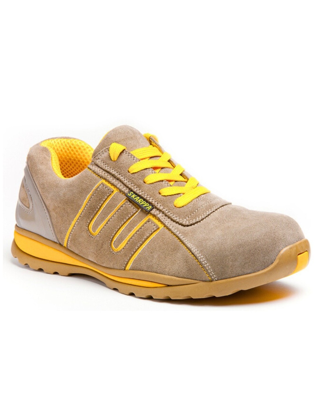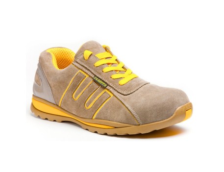 Fabricado en suede beige con detalles amarillos, combina puntera fibra de vidrio (40% más ligera que el acero) y suela EVA+caucho que proporciona ligereza, comodidad y excepcional absorción de impactos en ambientes profesionales.