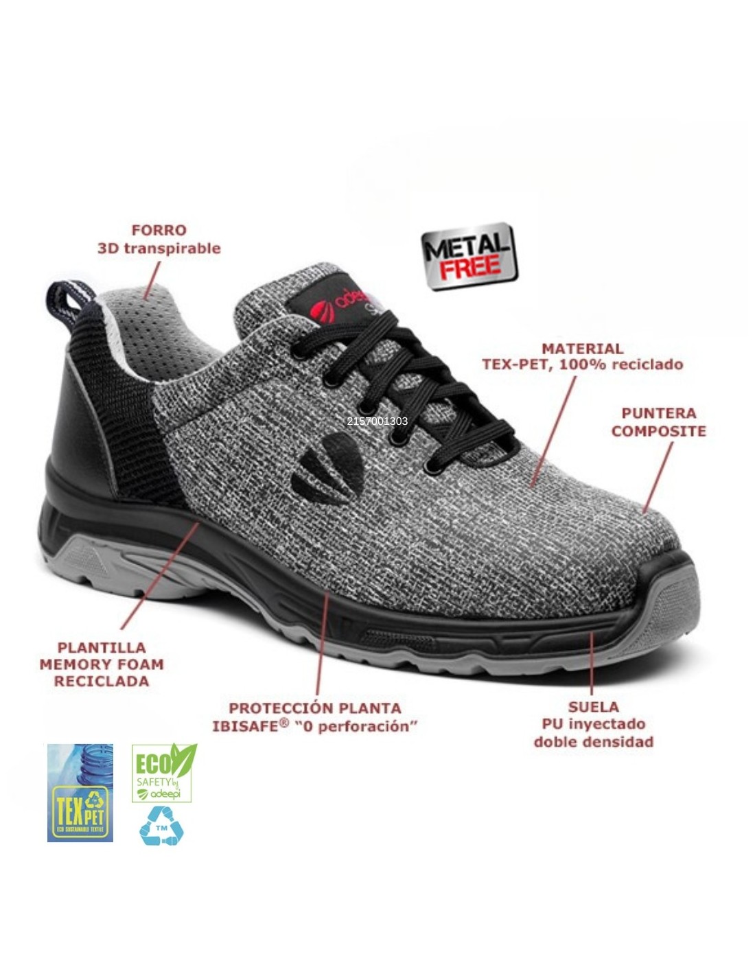 Elaborado con revolucionario tejido TEX-PET (poliéster reciclado de botellas PET), incorpora puntera composite ultraligera, plantilla IBISAFE "0 perforación" y plantilla interior Memory Foam reciclada. Una elección responsable que combina sostenibilidad, confort y la máxima protección profesional.